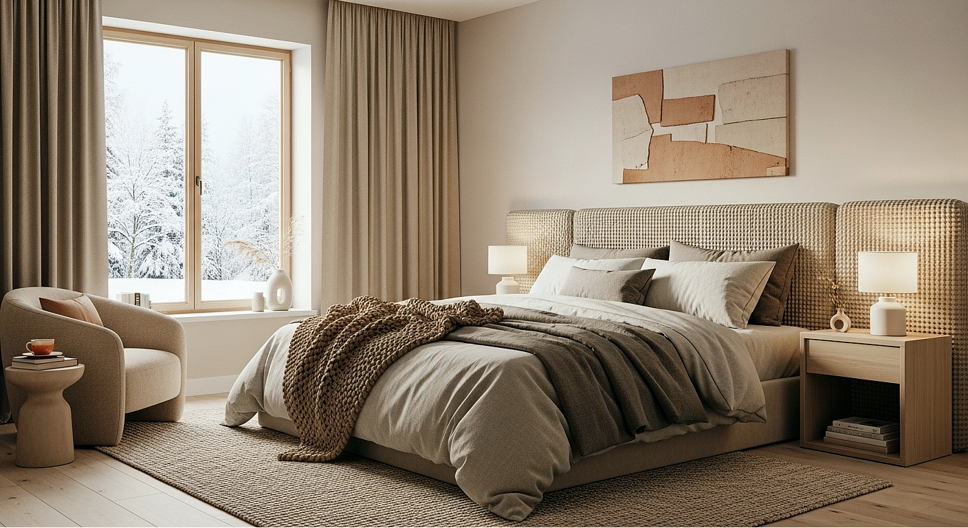• Neutral bedrooms now embrace warm earth tones and layered textures rather than stark whites, creating depth through tactile materials like bouclé, linen, and natural wood.